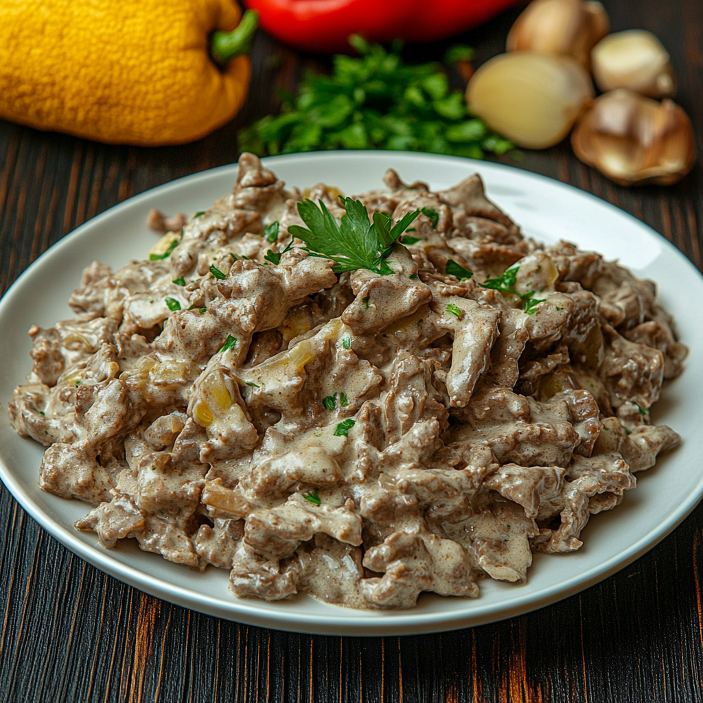 Состав: говядина, сметана 9%, лук репчатый, мука пшеничная высший сорт, масло подсолнечное, перец черный, паприка, соль