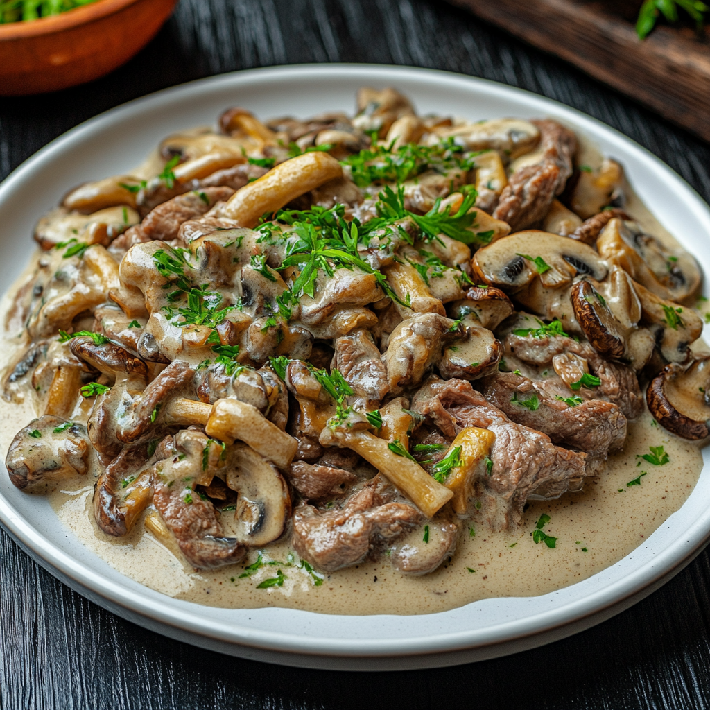 Говядина с грибами в сливочном соусе (500 гр.)