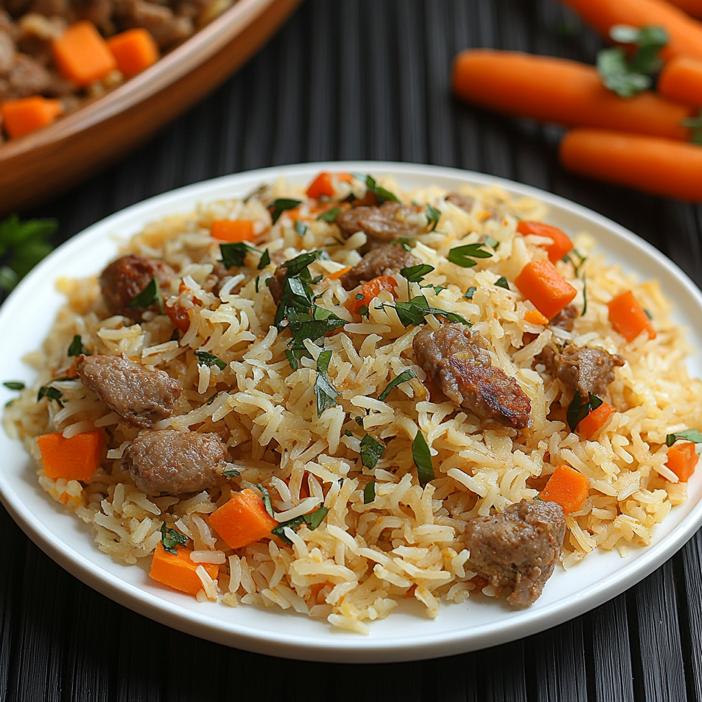 Состав: куриная грудка, рис басмати, морковь, лук репчатый, масло подсолнечное, куркума, барбарис, соль