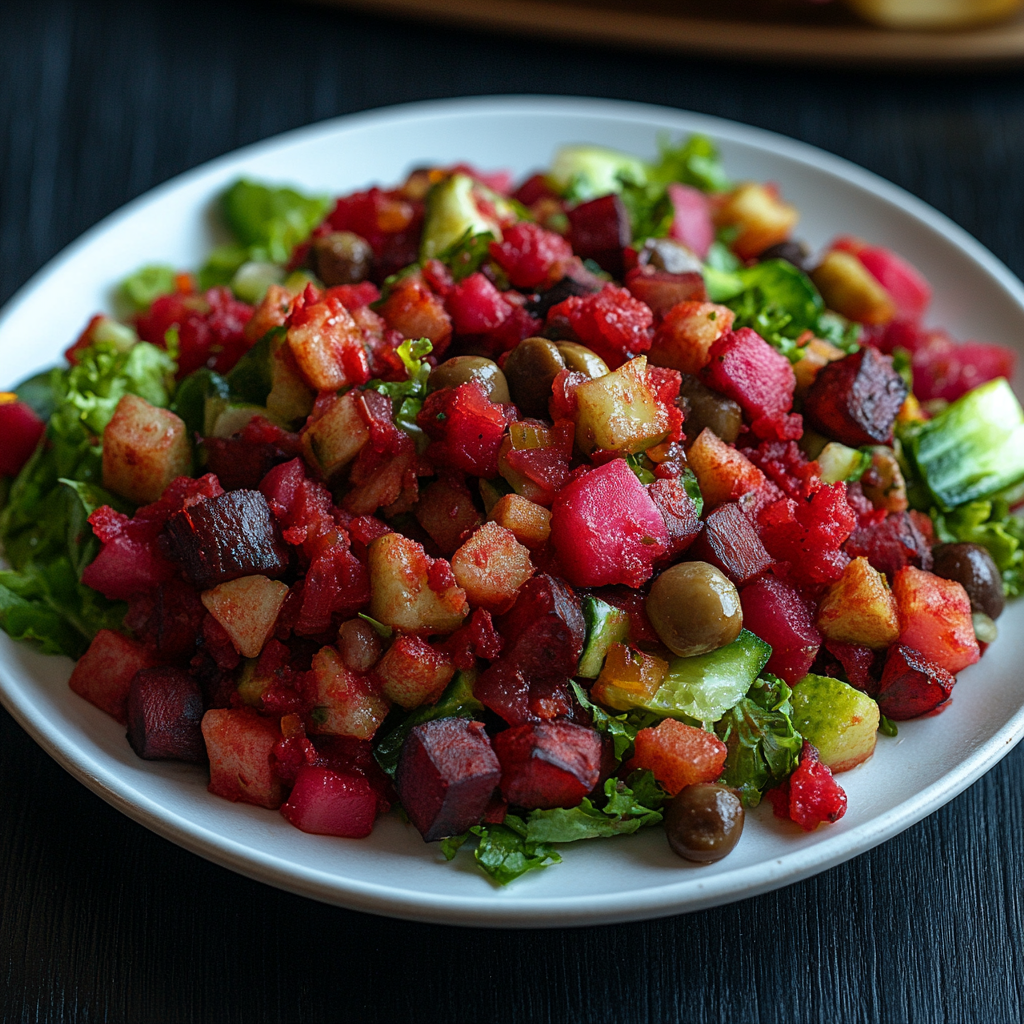 Состав: свекла, картофель, огурец соленый, лук репчатый, зеленый горошек консервированный,