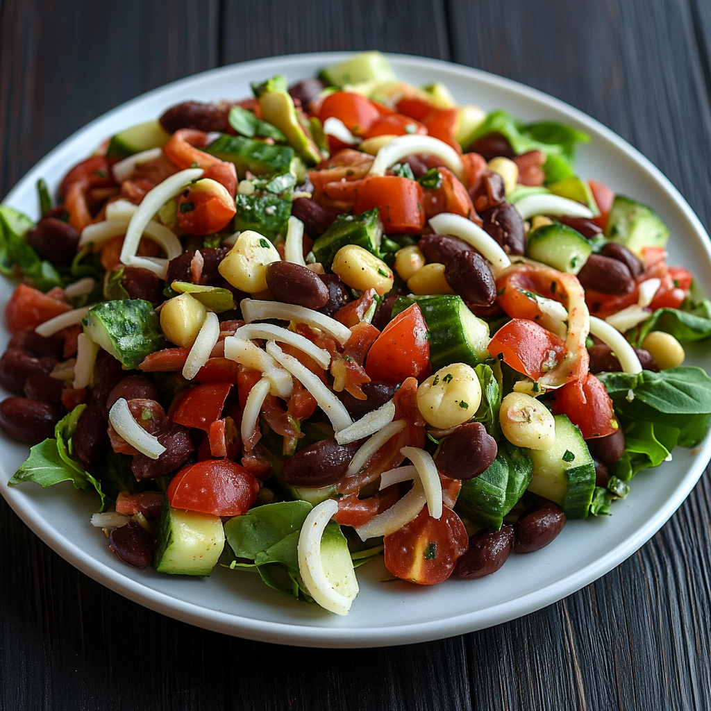 Состав: фасоль консервированная, авокадо, помидоры, сладкий перец, огурец свежий, лимонный сок, соль, оливковое масло