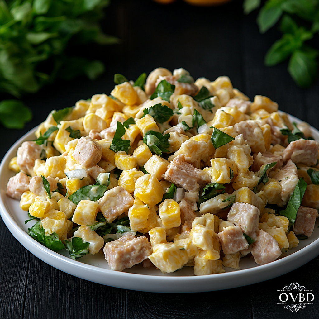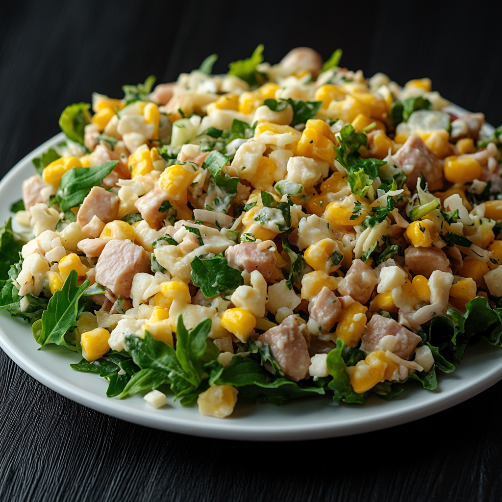 Состав: куриная грудка, ананасы консервированные, сыр твердый сливочный, кукуруза консервированная, майонез, соль