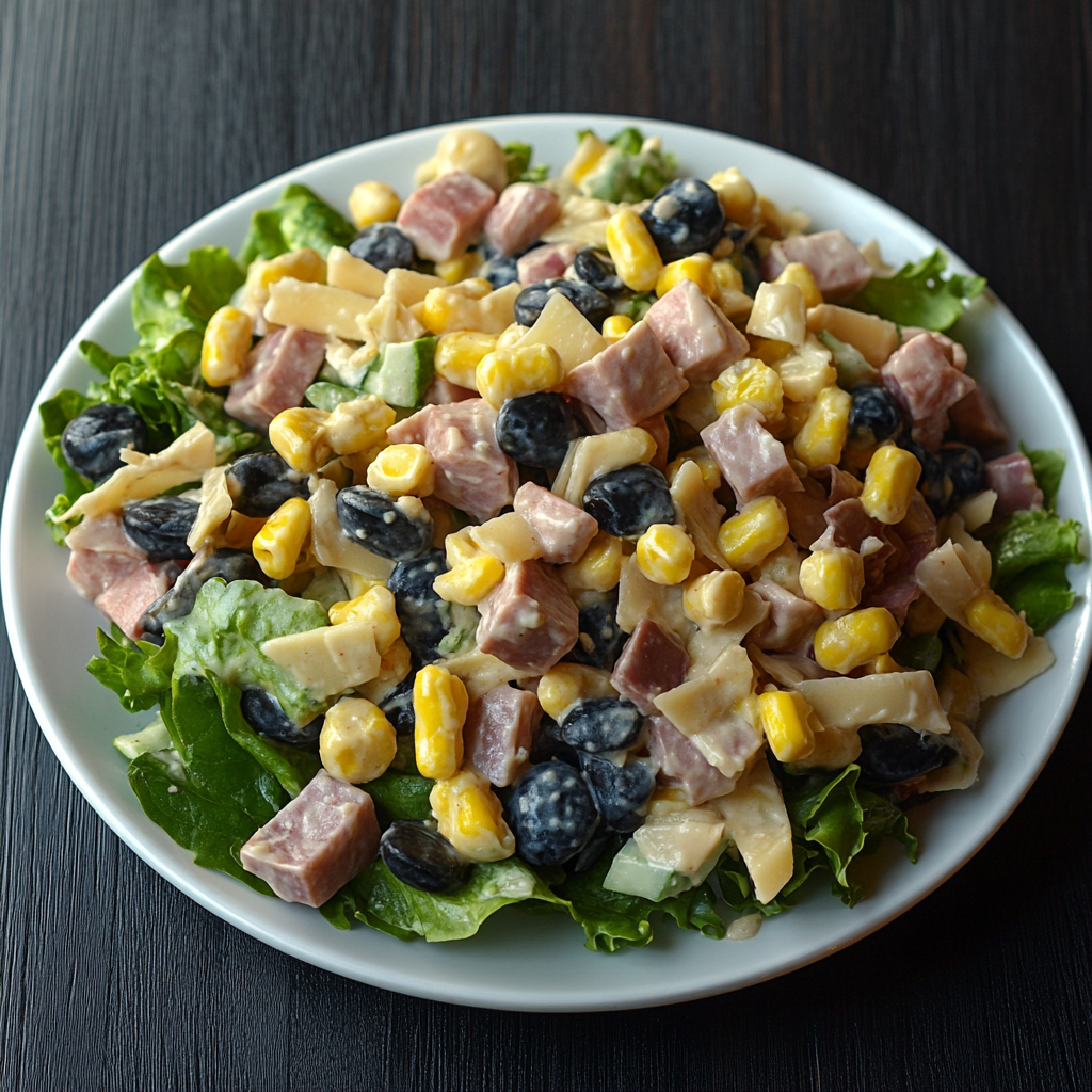 Состав: ветчина, маслины, шампиньоны маринованные, яйца куриные, кукуруза консервированная, майонез, соль