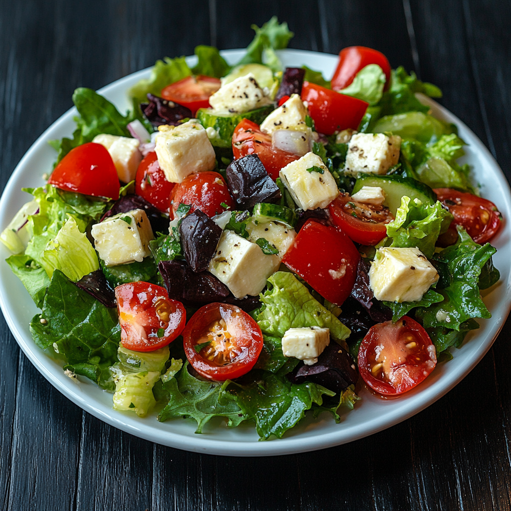 Состав: маслины, сыр фета, огурец свежий, помидоры, сладкий перец, лук репчатый красный, масло оливковое, лимонный сок, соль