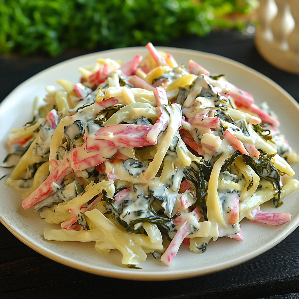 Состав: морская капуста, крабовые палочки, яйцо куриное, лук репчатый, огурец свежий, майонез, соль