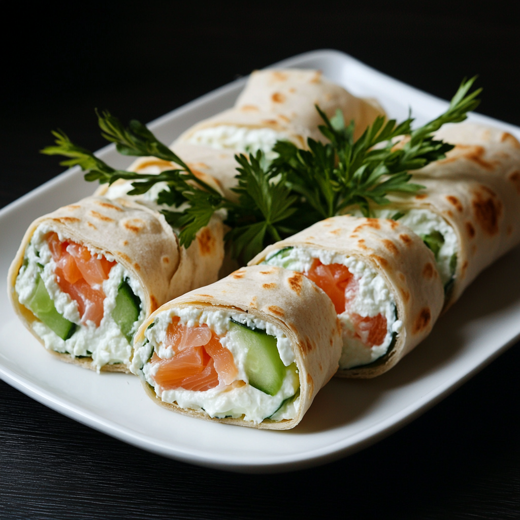 Состав: семга, сыр творожный, огурец свежий, тортилья